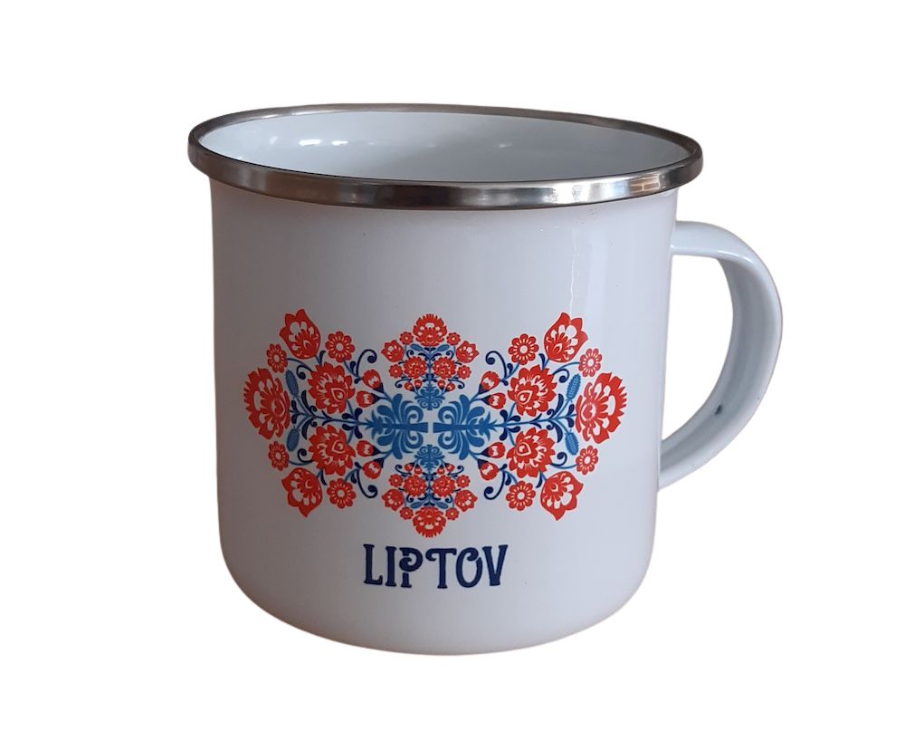 Ľahký plechový hrnček s folklórnym motívom a nápisom Liptov a Slovensko